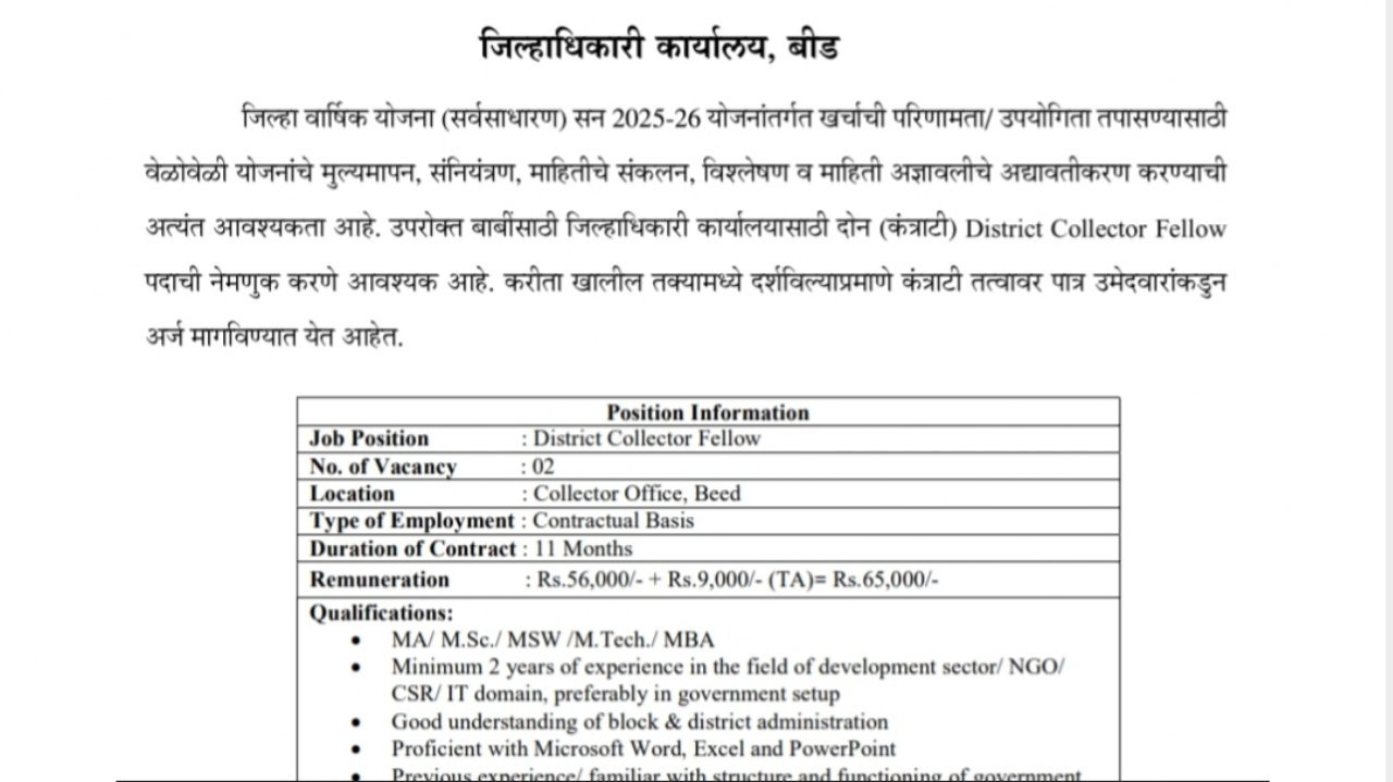 Breaking news | ‘जिल्हाधिकारी कार्यालय’ अंतर्गत नवीन जागांसाठी जाहिरात प्रसिद्ध! | आजच ऑनलाईन अर्ज करा.