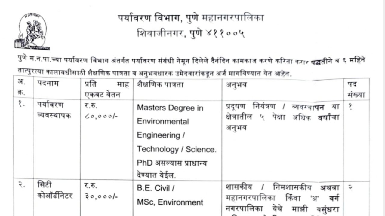 पुणे महानगरपालिका (PMC) अंतर्गत विविध पदांसाठी भरती प्रक्रिया सुरू आहे. खालील माहिती त्यासंबंधी आहे: