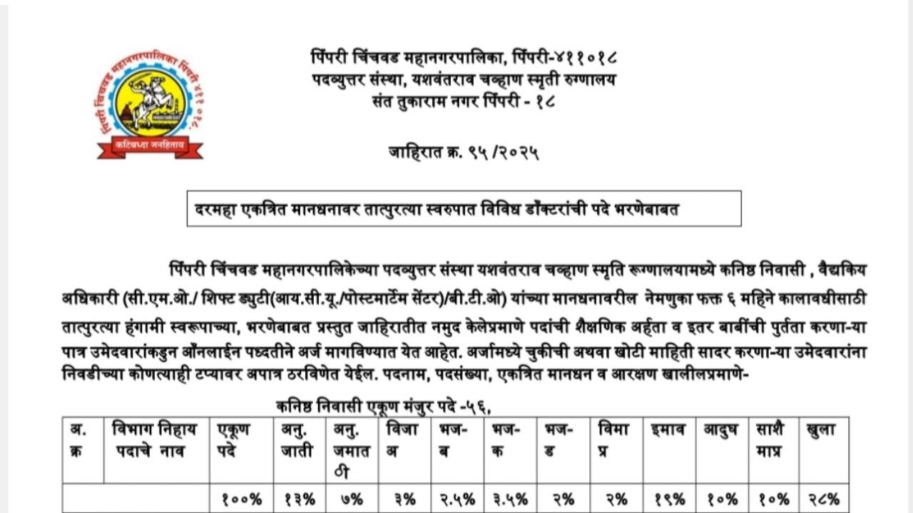 पिंपरी‑चिंचवड महानगरपालिकेची (PCMC) नवीन भरती जाहिरात 2025 खालीलप्रमाणे आहे: