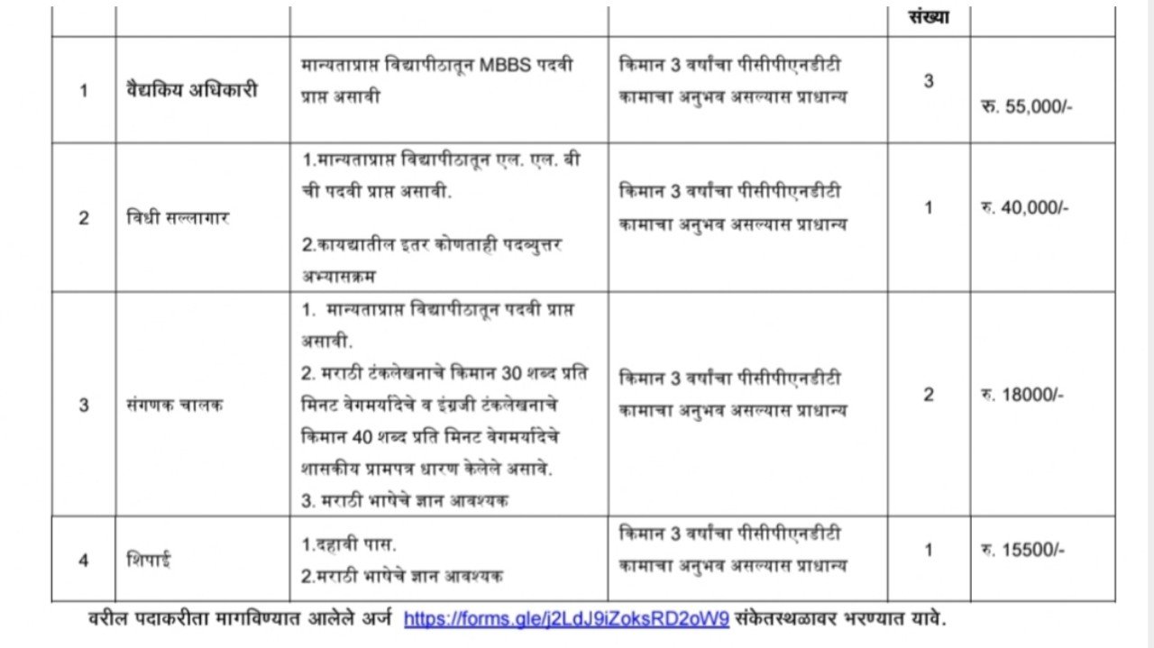 वैद्यकीय अधिकारी, कायदेशीर सल्लागार (ही पदे देखील भरतील)