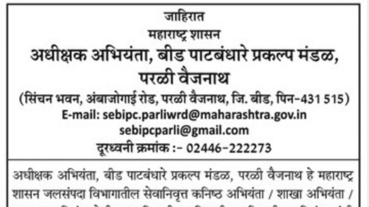 new bharti | पाटबंधारे विभागात विविध जागांसाठी जाहिरात प्रसिद्ध!आजच अर्ज करा.