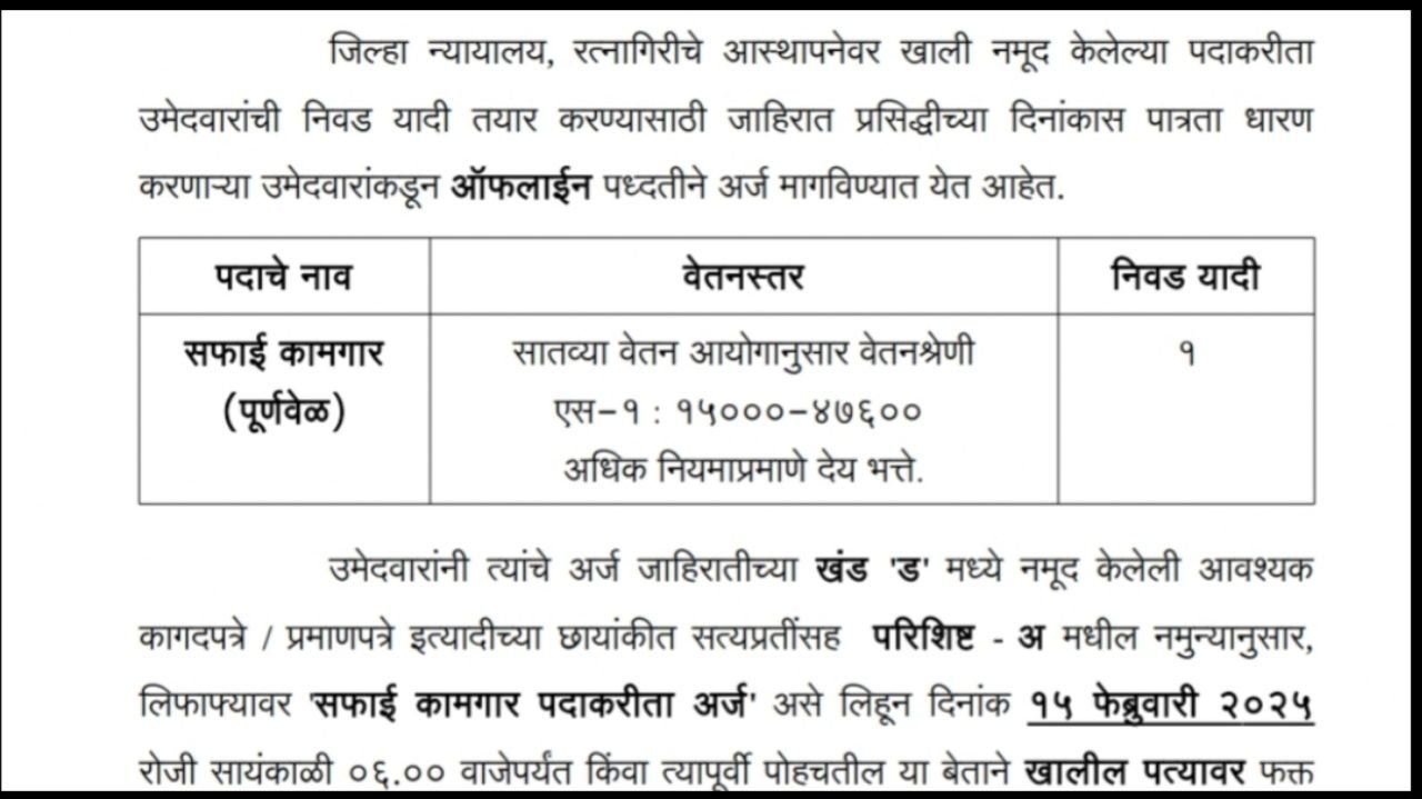 Government Job | जिल्हा न्यायालयात अशिक्षित / 7वी / 10वी / 12वी उत्तीर्ण उमेदवारांची भरती वेतन – 15,000 ते 46,600 रूपये.